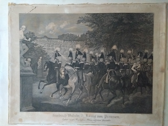Friedrich Wilhelm IV., König von Preussen, begleitet von den Prinzen seines Hauses und seinen Generalen. Stahlstich von F. [Friedrich] Randel nach C. Böhme. [Friedrich Wilhelm IV. beim Ausritt mit Söhnen und Generalen im Park von Sanssouci, links im Hintergrund das Schloß Sanssouci]. Berlin & Frankfurt a. O., Trowitzsch & Sohn, 1842. Quer-4°. 23,5 x 31,5 cm auf 28,8 x 36,5 cm grossem Blatt. Stark gebräunt, Rand stark braunfleckig. Rand hinterlegt, wohl ausgerahmt, teils mit Einrissen, einer oben links reicht bis ins Bild hinein. - Versandkosten innerhalb Deutschlands EUR 5,00 (versicherter Versand).