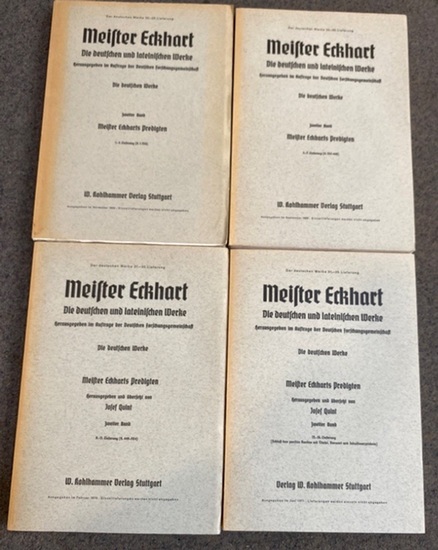 Die deutschen Werke. Erster Band: Predigten. Hrsg. von Josef Quint. Stuttgart, Kohlhammer 1958. XXXI, 602 und das "VorläufigeVerzeichnis der Abkürzungen" 4°, Leinen. Rücken berieben und fleckig (siehe Bild), Schnitt ebenfalls etwas stockfleckig.