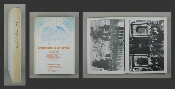 Visualisierte Denkprozesse. Balz Burkhard, Gianfredo Camesi, Luciano Castelli, H. Huber, Herbert Lienhard, Urs Lüthi, Dieter Meier, Gérald Minkoff, Markus Raetz, P.B. Stähli, Aldo Walker. Sonderausstellung. Überlegungen zum Städtebau. A. Henggeler, A. Losego, P.F. Althaus. Überlegungen zum Systembau. Team 66. Redaktion: Jean-Christophe Ammann. Kunstmuseum Luzern. 15. Februar bis 29. März, 1970. 4°. Ca. 125 Bl. Mit s/w. Abbildungen. Originalbroschur. "Die Ausstellung 'Visualisierte Denkprozesse' bildet die Fortsetzung der von P.F. Althaus konzipierten Reihe 'Junge Kunst'." - Rücken mässig vergilbt und mit handschriftlichem Titel. Einband etwas fleckig.