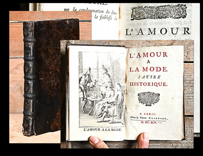 L'Amour à la mode, satyre historique. Paris, veuve Coignard, 1695. circa 16 x 10 cm., Engraved frontispiece, title in red and black, 10 ff., 190 pp., 1 blank leaf. Contemporary full calf First edition of this satire by Jeanne-Michelle de Pringy (1660-1709; born: Jeanne-Michelle Hamonin de Maranville). The French Wikipedia sums up her favourite topics: "Son sujet de prédilection est l'amour-propre chez les femmes. Elle s?est donc donnée la tâche de le peindre sous ses différents aspects et nuances". - Minor browning, only the last leaves with marginal staining, binding rubbed, spine at both ends with some worming and little loss, but solid.