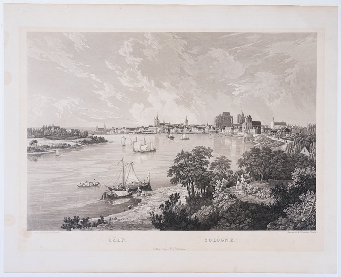 Cöln. Cologne. - Coblenz:, Jacob Hölscher, [um 1836]. Aquatinta 29 x 42,5 cm, Blattgröße 39,5 x 50 cm. Das Aquatinta von R. Bodmer, gezeichnet von C. Bodmer. Gezeigt wird der Blick auf Köln. Mittig der Rhein mit reicher Schiffspassage, vorn rechts eine Grünanlage mit Spaziergängern. Die Stadtansicht mit dem im Bau befindlichen Dom in der horizontalen Bildmitte. - Karl Bodmer 1809 - 1893, Maler und Lithograph; sein Bruder Rudolf Bodmer, 1805 - 1841, Kupferstecher. Thieme-Becker 4/170. - Das Papier leicht, im Bereich des alten Passepartoutausschnittes etwas intensiver gebräunt. Im Randbereich des Blattes leicht fleckig. Sehr stimmungsvolle, sanft tonige Darstellung, ein schönes Blatt.