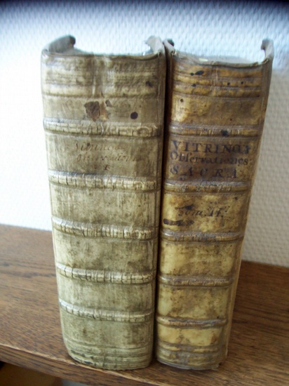 Sacrarum observationum. 2 Bde. (1: Tl. 1-4; 2: 5-6 u. 7). Tl. 5-6 in: Editio tertia. Franeker, Gyselaar, 1700. Tl. 5-6: Amsterdam, Horreum, 1727 u. 7: Franeker. Horreum, 1726. Kl.-4°. M. 1 Kpfr.-Taf. u. gest. Tit.-Vign. 15 Bl., 221 S. (ohne das letzte weiße); 4 Bl., S. 225 - 471; 4 Bl., S. 475-837 (ohne das erste u. letzte weiße); 5 Bl., S. 841-1090, 15 Bl.; 8 Bl., 508 S., 12 Bl., 1 Bl., 254 S. Bd. 1: Prgtbd. d. Zt. mit Blindprägung (Deckel angestaubt, berieben u. etwas ankoloriert, Buchblock leicht feuchtwellig, Modernes Exlibris im Innendeckel. Bd. 2: Ebenso Prgtbd. d. Zt. Einbd. fleckig, etwas wellig. Ecken abgestoßen. Ohne Vorsätze, Bindung sichtbar u. gelockert. St. u. Notiz a. Tit. Teilw. etwas wurmstichig. Beide Bde. gebräunt u. braunfl. Titel in Rot u. Schwarz. Studien zum Alten und Neuen Testament, meist exegetischen Inhalts. Vitringa, gefeierter Theologe (1659-1722), lehrte in Franeker. "Die Bedeutung seiner Exegese liegt vor allem in der Sorgfalt und Gründlichkeit, mit welcher er Textkritik, Grammatik, Lexikon, exegetische Überlieferung, überhaupt den gesamten exegetischen Apparat in staunenswertem Umfang auf die Ermittlung des sensus genuinus, des zeitgeschichtlichen Anlasses und Hintergrundes verwendet. In dieser Hinsicht zählt Vitringa bereits zu den modernen Exegeten" (RE XX, 706). - Die Kupfertafel dient zur Illustration der Untersuchung "de sephiroth kabbalistarum" und zeigt einen Mann in jüdischer Tracht mit Zuordnung der schöpferischen Weltpotenzen im Sinne der Kabbala.- Gesamtwerk in einer Mischauflage.