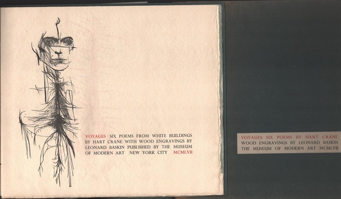 Voyages. Six poems from white buildings. With wood engravings by Leonard Baskin. New York, Museum of Modern Art, printed at the Gehenna Press, 1957. 16 S. Mit Holzschnittillustrationen. Druck in Rot und Schwarz, tls. auf Bütten, tls. auf Japanpapier (eine Doppeltafel gefaltet). 24,5 cm x 28,5 cm. OBroschur mit Kordelheftung und zweifarb. Deckelschildchen. Beiliegend: Original-Flügelmappe (dieser defekt u. außen lichtspurig) in 3 losen Teilen. Limitierte Auflage von 975 handnum. Exemplaren, SIGNIERT von Leonard Baskin. - Hart Crane (1899-1932), amerikanischer Dichter. Leonard Baskin (1922-2000), amerikanischer Bildhauer, Zeichner und Grafiker, zugleich Gründer der Gehenna Press, einer der ersten u. bedeutendsten Kunstpressen der Welt. - Vorderdeckel der Innenmappe mit wenigen kl. Tuschsprenkeln, sonst gut und sauber.