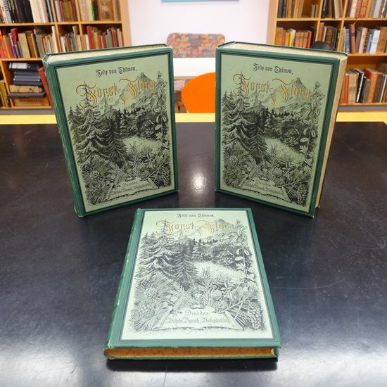 Dr. David Dietrich's Forst-Flora. Beschreibung und Abbildung aller für den Forstmann wichtigeren wildwachsenden Bäume und Sträucher, sowie der nützlichen und schädlichen Kräuter, Gräser und Sporenpflanzen. Mit 300 kolorierten Tafeln. Dresden, Wilhelm Baensch Verlagshandlung, 1885. Quart. XIX, 202, 146 S. Original Festeinband mit Rücken und Titelvergoldung., Einbände|Rücken|Tafel Band 3|Tafeln Band 2 Band 1: Text; Band 2 Tafel 1-150.; Band 3: Tafel 151-300. Einband teilweise leicht Berieben. Innen sehr Sauber. Schönes Exemplar.