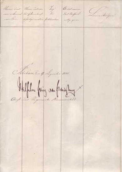 Als Wilhelm Prinz von Preußen eigenhändig unterschriebene Akte. 9.12.1885. 1885. 33 x 21 cm. 4 Blatt gefaltet. (Sehr guter Zustand). Wilhelm II., ( Friedrich Wilhelm Viktor Albert von Preußen * 27. Januar 1859 in Berlin; + 4. Juni 1941 in Doorn, Niederlande), aus dem Haus Hohenzollern war von 1888 bis 1918 letzter Deutscher Kaiser und König von Preußen. Als Prinz Wilhelm von Preußen war er u. a. Regimentskommandeur des Garde-Husaren-Regiments, Berlin vom 16.6.1885 - 26.1.1888. In dieser Eigenschaft unterzeichnete er die "Nachweisung der beim Garde-Husaren-Regiment im IV. Quartel 1885 abgehaltenen Standgerichte". 2 Delinquenten, deren "Vergehen" und die Urteile sind in der Akte beschrieben. Sie reichten vom strengen Arrest bis zur Haft.