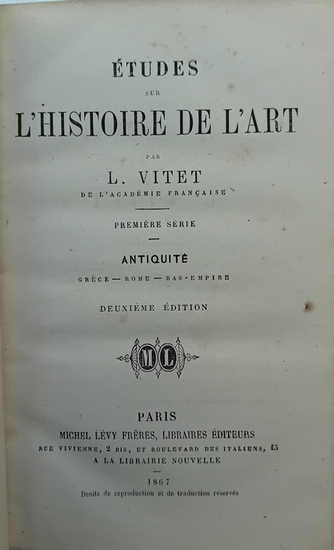 Études sur l'Histoire de l'Art. 4 Bände: Antiquité / Moyen Age / Temps modernes 1+2. 2e édition, Paris (Lévy) 1867-68. XXVIII S., 370 S., 432 S., 416 S., 401 S., Halbleder . Schöne Bände in dunkelblauem Halbleder mit falschen Bünden, marmoriertem Schnitt und marmorierten Vorsätzen. Durchgehend etwas stockfleckig, sonst sehr gut.