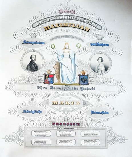 Grosser, kolorierter und goldgehöhter Einblattdruck zur Hochzeit. Gedicht seiner königlichen Hoheit Maximilian? an ihre königliche Hoheit Maria, königliche Prínzessin von Preussen? am Verlobungstage. München, 1842. circa 57 x 42 cm., 1 Blatt. gerollt Schönes Kleinplakat mit zwei Portraits in Lithographie sowie Wappen und Verzierungen in Gold und Farben. Die Hochzeit fand am 5. Oktober 1842 in Berlin statt. - Einheitlich leicht nachgedunkelt, sonst sauber und schön in kräftigen Farben.