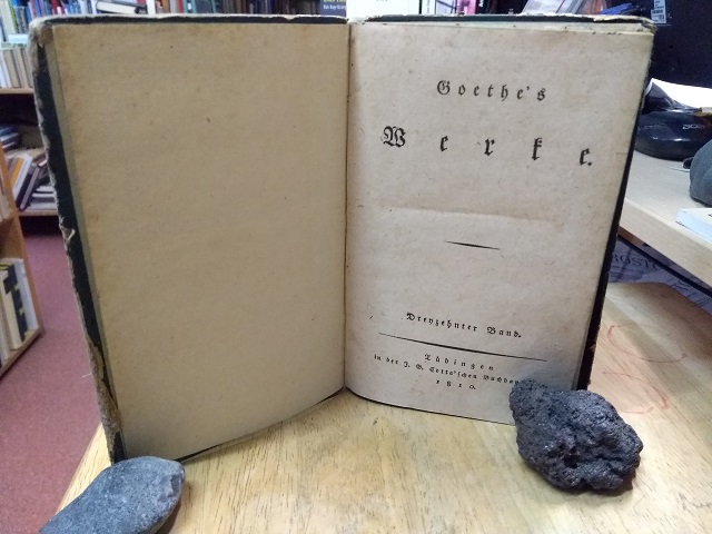 Goethe's Werke. Dreyzehnter Band. Die Wahlverwandschaften. Ein Roman. 2 Teile in einem Band. (Band 13 der dreizehnbändigen Werkausgabe). Tübingen, in der J. G. Cotta'schen Buchhandlung, 1810. [1], 414 S. Pappband der Zeit mit zwei Rückenschildern (eines beschädigt) u. dreiseitigem Schnitt in Grün. Leicht gebräunt u. fleckig, teils stärker, besonders Schnitt u. Ränder braunfleckig, Äusseres angestaubt bzw. abgegriffen. Einband teils stark berieben u. bestossen. Vorsätze leimschattig, innen meist sauber. - WG 2.66 - Hagen 24 (der Ausgabe nachträglich hinzugefügter Band) - Die Erstausgabe des Textes erschien im Jahr 1809.