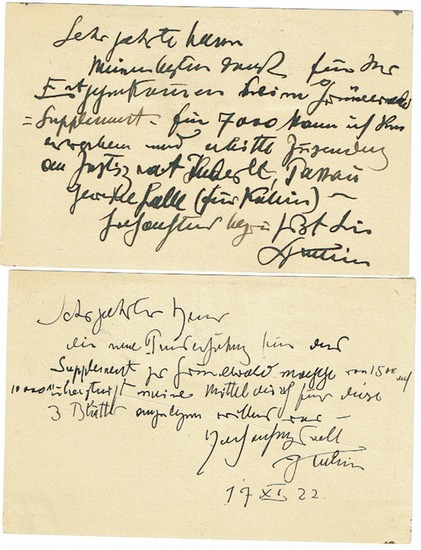 2 eigenh. Postkarten mit Unterschrift. (Wernstein) 17. und 25.XI.1922. Kl.-8vo. 2 pp. An die "Gesellschaft für Zeichnende Künste" in München.17. November. "...die neue Preiserhöhung für das Supplement zu Grünewald ... übersteigt meine Mittel die ich für diese 3 Blätter anzulegen willens war..."25. November. "...besten Dank für das Entgegenkommen beim Grünewald-Supplement. Für 7000 kann ich sie erwerben...".