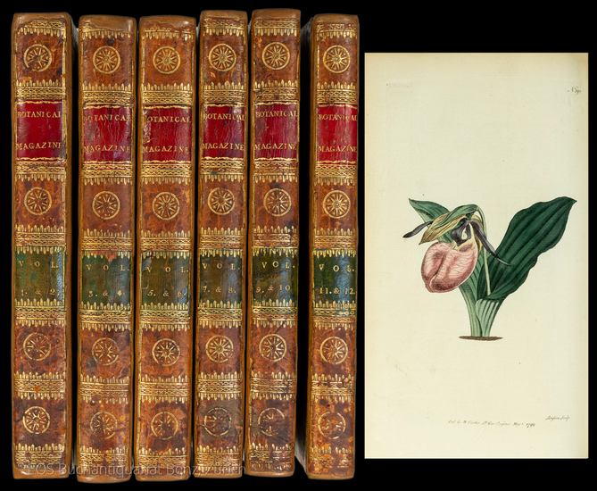 The botanical Magazine. Or, flower-garden displayed. In which the most ornamental foreign plants, cultivated in the open ground, the green-house, and the stove, are accurately represented ijn their natural colours. To which are added class, order, generic and specific characters, according to the celebrated Linnaeus, their places of growth, and times of flowering. Together with the most approved methods of culture. A work intended for the use of such ladies, gentlemen, and gardeners, as wish to become scientifically acquainted with the plants they cultivate. London, W. Curtis, 1793-1798. 8°. 1- 432 S., 12 title pages, 2 pages of Index.. With 432 coloured plates. Gilt contemporary calf with red spine labels. + Wichtig: Für unsere Kunden in der EU erfolgt der Versand alle 14 Tage verzollt ab Deutschland / Postbank-Konto in Deutschland vorhanden +, 4973DB|4973DB_2 Vols. I to XII in six volumes. Nissen 227, 2350. Pritzel 74, 2007. Blunt 183, I. First edition. Vols. I and XII of the first series conducted by William Curtis. "It has suggested, but without any positive evidence, that some of the earliest drawings in the Botanical Magazine were made by Curtis himself; but William Kilburn and James Sowerby, joined the following year by Sydenham Edwards, were responsible for almost the whole work of the first twenty-eight years - most of it being by Edwards, with Sansom as engraver" (Blunt). - With 6 mounted ex libris labels (library of Mary Ferguson) on the backside of the front covers. - Backs professionally restored. Flying leafs are slightly foxed. Otherwise a clean copy in very good condition.