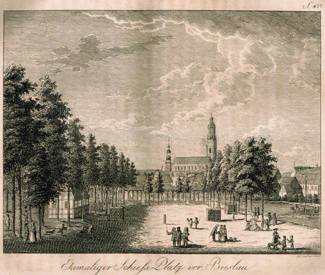 Topographische Chronik von Breslau. 4.-6. (von 9) Quartal. Nr. 40-78. Mit je 1 Titel-Vignette u. 5 teils gefalt. Kupfer-Tafeln (von 9 ?). Breslau, Gratz u. Barth, 1806. Gr.-8°. 2 Bll., S. 305-406, 2 Bll., S. 407-508 u. 2 Bll., S. 509-610. Ppbd. d. Zt. m. verg. RSch. (berieben, bestoßen u. mit Abschabungen im Bezugspapier, kl. Fehlstelle am RSch.). Kupfer-Tafeln: 1. Prospect der Kirch u. Closters zu S. Dorothea (...) in Breslau. 2. Prospect der anderen Evangelischen Haupt-Kirche zu St. Maria Magdalena in Breslau. 3. Iohann Hess (Portrait). 4. Ehemaliger Prospect des Thurmes an der Elisabeth Kirche. 5. Ehemaliger Schiess-Platz vor Breslau. - Papierbedingt nur teils leicht gebräunt u. nur teils minimal stockfleckig, Exlibris auf Vorsatz.