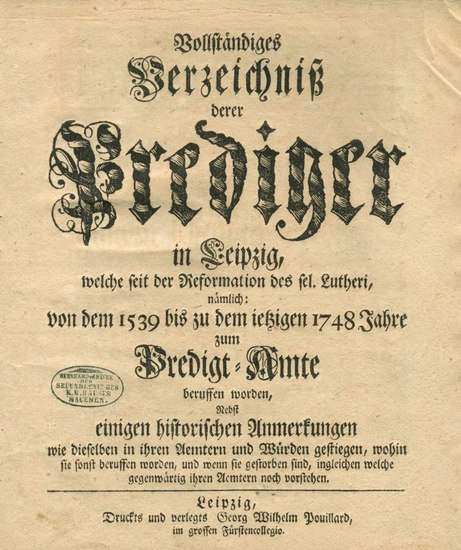 Vollständiges Verzeichniß derer Prediger in Leipzig, welche seit der Reformation des sel. Lutheri, nämlich: von dem 1539 bis zu dem ietzigen 1748 Jahre zum Predigt-Amte beruffen worden, nebst einigen historischen Anmerkungen wie dieselben in ihren Aemtern und Würden gestiegen, wohin sie sonst beruffen worden, und wenn sie gestorben sind, ingleichen welche gegenwärtig ihren Aemtern noch vorstehen. Leipzig, Georg Wilhelm Pouillard 1748. * 48 Seiten. 19 x 17 cm. Späterer Pappband mit Marmorpapierbezug (leicht bestoßen und berieben). *** Rothe-Heilemann II, 281. - Erste Ausgabe. - Seltenes Predigerverzeichnis von Leipzig, welches bis 1777 drei Auflagen erlebte: Nikolaikirche, Thomaskirche, Neukirche, Peterskirche, Hospitalkirche zu St. Johannis, Hospital-Kirche zu St. Georgen, Lazaret-Kirche. - Durchschossenes Exemplar mit zahlreichen zeitgenössischen Ergänzungen bis auf das Jahr 1783. - Titel alt gestempelt. Oben rechts etwas bestoßen. - Gutes Exemplar.