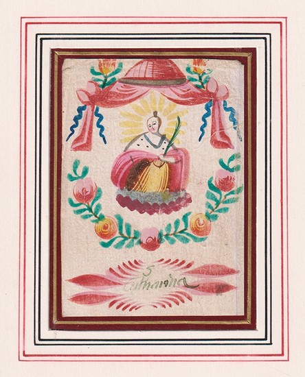 S. Catharina. o. O. [spätes 18. Jahrhundert]. Gouache auf Kreidepapier. 10 x 7 cm (Blattgr.). Etwas knittrig, knapp beschnitten. Dargestellt ist die Heilige Katharina von Alexandrien in einem Medaillon unter einem Baldachin, darunter eine Rosengirlande. Der Legende nach soll Katharina im frühen 4. Jahrhundert das Martyrium erlitten haben. Zunächst sollte sie gerädert werden, doch durch ihre Gebete zersprang das Rad, schließlich wurde sie enthauptet. Ihre Gebeine sollen zum Berg Sinai gebracht worden sein, wo über der Fundstelle das Katharinenkloster errichtet wurde. Ihr Gedenktag ist der 25. November.
