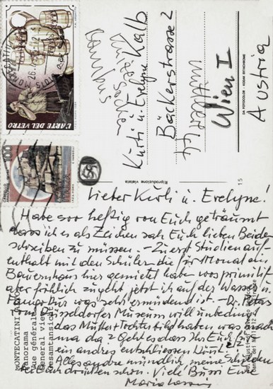 Eigenhändige Ansichtspostkarte (Montecatini Alto) m.U. (Montecatini Terme, 26.4.1985 Poststempel). _. 1. An "Kurti" Kurt Kalb und "Evelyne" Evelyn (Oswald) von ihrem Kuraufenthalt in der Toscana. "Habe soo heftig von Euch geträumt dass ich es als Zeichen sah Euch lieben Beiden schreiben zu müssen. - Zuerst Studienaufenthalt mit den Schülern die für 1 Monat ein Bauernhaus hier gemietet haben wos primitif(!) aber fröhlich zugeht, jetzt ich auf der Wasser u. Fangokur was sehr ermüdend ist. - Dr. Peters vom Düsseldorfer Museum will unbedingt das Mutter +Tochterbild haben was mach ma da? Geht es dass Ihr Euch für ein andres entschliessen könnt?? ... meine Schulden bei Euch drücken schon ...". Für dieses und auch für andere Verhältnisse der Künstlerin zu ihren Bildern gern vorkommende Haltung. - 1976 hatte die Künstlerin in der Galerie von Kurt Kalb in der Prinz Eugen Straße eine Ausstellung mit etlichen ihrer heute als Hauptwerke angesehenen Bildern veranstaltet (ohne Verkaufserfolg), ehe sie 1980 auf einen Lehrstuhl nach Wien berufen worden ist. 1985 fand die erste große Retrospektive im Museum moderner Kunst in Wien statt, sowie ihre Ausstellung im Kunstmuseum Düsseldorf (Kunstpalast), das von Hans Albert Peters (1937-2014) von 1979 bis 1995 geleitet worden ist. - Von fremder Hand über die Adresse geschrieben: Knize Socken mittlere 44 Bambus.