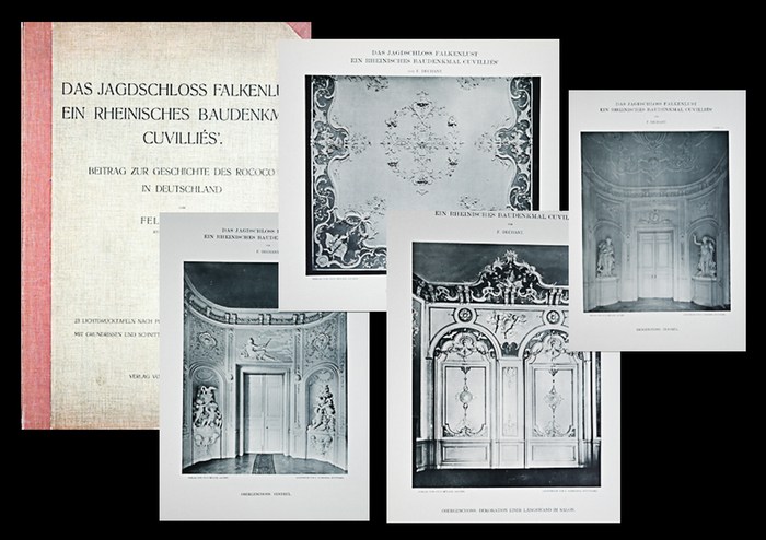 Jagdschloss Falkenlust ein rheinisches Baudenkmal Cuvillies. Aachen, Otto Müller, 1901. circa 47 x 35 cm., 24 SS., 1 Bl., 23+2=25 Tafeln. Original-Leinenmappe mit Deckeltitel Mit Grundrissen, Ansichten, Bauplänen, Details der Dekoration etc. - Exlibris der berühmten Jagdbiblithek Lindner (Tiliana). Nur gering nachgedunkelt, Mappe etwas berieben, sonst gut erhalten, sauber.