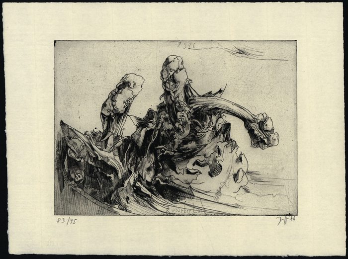 Rabarberland. 9.3.76. [Signierte Original-Radierung / signed original etching]. _. (Horst Janssen, geboren am 14. November 1929 in Wandsbek bei Hamburg, gestorben am 31. August 1995 in Hamburg. Zeichner, Grafiker, Autor, Plakatkünstler, Illustrator und Fotograf, einer der herausragendsten und produktivsten Zeichner und Grafiker des 20. Jahrhunderts). Nummer 83 von 95 nummerierten Original-Radierungen (Strich- und Flächenätzung, Kaltnadel auf Kupfer) auf leicht chamoisfarbenem Büttenpapier. Von Horst Janssen unterhalb der Abbildung in Blei signiert und datiert (76), im Druck beschriftet und datiert. Maße Blatt: 25,7 x 34,3 cm. Maße Abbildung: 18 x 24,8 cm. Werkverzeichnis Frielinghaus 1976/28. Sehr gutes Exemplar.