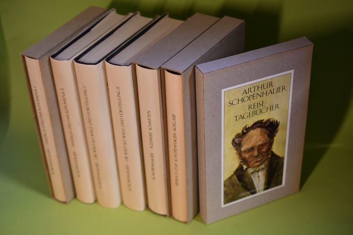 Werke in fünf Bänden + Reisetagebücher + Beibuch zur Schopenhauer Ausgabe Herausgegeben von Ludger Lütkehaus Zürich : Haffmans 1988. 1. - 3. Tsd.; 7 Bücher 676+751+728+483+567; 280; 387 S.; 21cm Leinen. 0 Zustand: Leineneinband mit Schutzumschlag (etewas gebräunt, wenige mit hinterlegtem Einriss), vier von sieben mit Schuber (teils mit geleimten Einriss), Dünndruck, Leseb#ndchen; insgesamt sehr guter Zustand --- Inhalt: Die Welt als Wille und Vorstellungen I + II (1: Vier Bücher nebst einem Anhange der die Kritik der Kantischen Philosophie enthält, 2: Welcher die Ergänzungen zu den vier Büchern des ersten Bandes enthält), Kleinere Schriften, Parerga und Paralipomena I + II; Reisetagebücher, Beibuch zur Schuopenhauerausgabe. -- Die vorliegende Neuedition folgt als erste Schopenhauer-Werkausgabe wort- und zeichengetreu des Autors Ausgaben letzter Hand. F2-7.