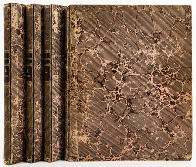 Vollständiges Lehrbuch der gesamten Baukunst. - [4 Bände]. - Stuttgart; Wien:, Hoffmann; Gerold, 1833-1838. 4 Bände: 2 Bll., 183 Seiten, 2 Bll. (Errata), V Tafeln; 2 Bll., 168 Seiten, 1 Bl. (Errata), XX Tafeln; xi (1), 176 Seiten, 1 Bl. (Errata), XXIX Tafeln; viii, 168 Seiten, 44 Tafeln; farbiger Blattschnitt, etwas jüngere marmorierte Ppbde., 25,5 x 20,5 cm. Konvolut von 4 Bänden des elfbändigen "Vollständigen Lehrbuchs der gesamten Baukunst" von Ludwig Friedrich Wolfram (1781-1846). - Die Ausführungen Wolframs teils sehr stark ins Detail gehend, etwa zum Bau von Schaufeln für Erdarbeiten; der Bearbeitung unterschiedlichster Bleche, etc. - Mit 1327 Abbildungen auf 98 lithographischen Tafeln. - Band 1.2: "Lehre vom Bauholze, oder: Lehre von dessen Wuchs, Eigenschaften, Beschaffenheiten und den Mitteln zu dessen längerer Erhaltung gegen Brand, Fäulniß, Insektenfraß u.s.w.; Berechnung der Widerstände gegen Bruch und Biegung in allen Lagen; vom Fällen, Transport; von der Berechnung, den Sorten der Wald- und Flößhölzer; Sämmtliche Holztheile beim Land-, Erd-, Wasser-, Maschinen- und Schiffbaue; Naturbeschreibung mit Angabe der Anwendung der Bauhölzer in allen Zweigen des Bauwesens, mit Rücksicht auf andere Gewerbe; übrige Nebenbaustoffe aus dem Pflanzenreiche" (mit 55 Abbildungen auf 5 Tafeln). - Band 1.3: "Lehre von den Metallen, insbesondere Lehre vom Roh-, Schmied-Eisen, Stahl, Blei, Zinn, Zink, Kupfer, Messing, Glockengut, den Bronzen u.s.w., von deren Gewinnung (Schmelzung), Verarbeitung durch Guß, Hämmern, Walzen u.s.w., deren Anwendungen, insbesondere in allen Zweigen des Bauwesens, in Gußformen, Barren, Blechen, Drähten, Nägeln u.s.w., von den Vergoldungen, Versilberungen, Metallfarben u.s.w. u.s.w." (mit 181 Abbildungen auf 20 Tafeln). - Band 2.1: "Lehre von den Erd-Bauarbeiten im Allgemeinen und vom Gründen der Gebäude ins Besondere" (mit 447 Abbildungen auf 29 Tafeln). - Band 3.1: "Lehre von den Formen und Grösenverhältnissen [sic] der Hochgebäude in allen ihren masiven [sic] Theilen, in Absicht auf Schönheit, Zweck, Festigkeit, Dauer, Wohlfeilheit etc., ins Besondere: Lehre I. von den krummlinigen Gestaltungen; II. vom Schönen im Allgemeinen; III. von der Schönheit der Bauwerke ins Besondere; IV. von den Mauerwerken überhaupt und den Freitreppen ins Besondere; V. von den Mauerwerken ins Besondere, und zwar 1) von den Gliedern und Gesimsen; 2) Thüren und Fenstern; 3) Feuermauern und Feuerungen; 4) Abtritten; 5) Gewölben; VI. von den verschiedenen Bauarten, dargestellt in den Grundzügen einer Geschichte der Baukunst aller Völker; VII. von der Stabilität der Futtermauern und Gewölbe" (mit 644 Abbildungen auf 44 Tafeln. - Die ersten beiden Bände ohne den Reihentitel. Sonst vollständig. - Berieben und bestoßen; innen teilks stark fleckig; sehr vereinzelt eselsohrig. Sonst ordentliche Exemplare.