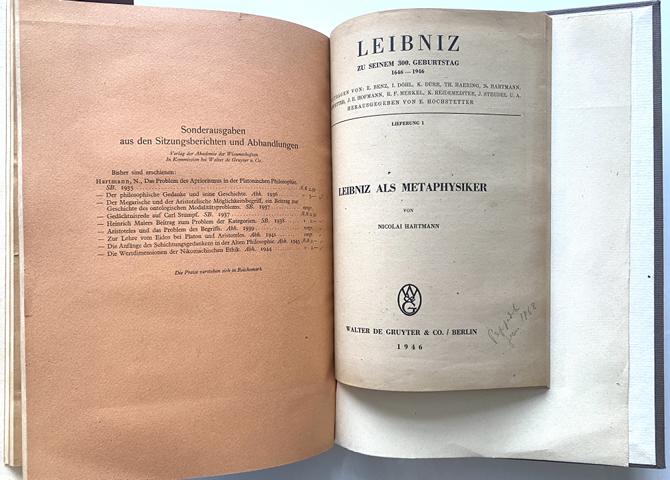 Sammlung von 6 Sonderausgaben bzw. Sonderdrucken 1936 bis 1946. Einzelausgaben bzw. Abhandlungen der Preuss. Akademie der Wissenschaften Berlin. Berlin, 1936-1946. 8° (4) und 4° (3). Orig.-Umschläge (teils etwas bestoßen, 1 mit kl. Eckfehlstelle und hinterl. Einriß). Zus. in Leinwand zusammengebunden. Enthält: Der Philosophische Gedanke und seine Geschichte. 1936. - Heinrich Maiers Beitrag zum Problem der Kategorien. 1938. - Aristoteles und das Problem des Begriffs. 1939. - Zir Lehre vom Eidos bei Platon und Aristoteles. 1941. - Die Anfänge des Schichtungsgedankens in der Alten Philosophie. 1943. - Die Wertdimensionen der Nikomachischen Ethik. 1944. - Dabei: Ders., Leibniz als Metaphysiker. 1946. (Leibniz zu seinem 300. Geburtstag. Lieferung 1). - Aus der Bibliothek von Prof. Pepperle mit seinem Namenszug auf Titeln, 1 Ausgabe auch mit seinen Bleistiftanstreichungen. B4-112 Bei Bestellungen auf Rechnung bleibt Vorkasse vorbehalten. Bestellungen erfolgen ohne Gewähr und gelten erst nach Bestätigung der Verfügbarkeit. Payment in advance is reserved for orders on account. Orders are made without guarantee and are only valid after availability has been confirmed. The shipping costs to non-EU countries may vary depending on the weight. We also offer cheaper shipping options for books up to 1000g.