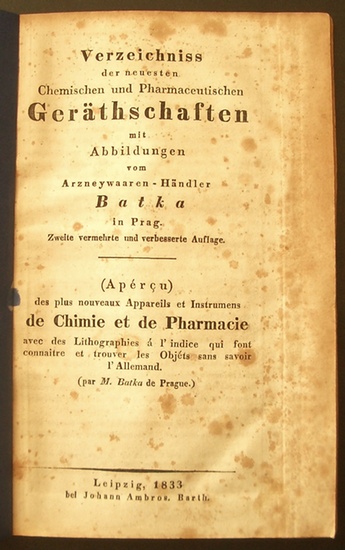 Verzeichniss der neuesten Chemischen und Pharmaceutischen Geräthschaften mit Abbildungen vom Arzneywaaren-Händler Batka in Prag Zweite vermehrte und verbesserte Auflage. Mit gefalt. lithogr. Tafel mit zahlreichen Abb. u. 10 (statt 12) Abb. im Text. Leipzig, J. A. Barth, 1833. 8vo. (19,9 x 12,6 cm). Titel, 24, 16 S. Neuer Buntpapierumschlag.