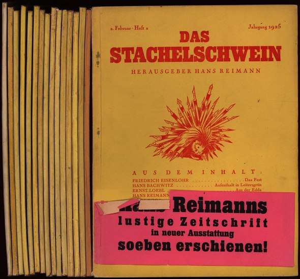 Das Stachelschwein. 2. Jahrgang, 1925. Heft 2-17. 16 Hefte (von 24). Frankfurt am Main, Verlag Das Stachelschwein, 1925. Groß-8°. 23,5 x 16 cm. Pro Heft 64 Seiten. Klammergeheftete Original-Broschuren, Heft 2, 3, 6-10 und 12-14 mit den vom Verlag aufmontierten Papierschildchen. Erste Ausgabe. Mit einigen Tafeln und Textabbildungen in Schwarz-Weiß. "Das Stachelschwein" war eine illustrierte Zeitschrift für Humor und Satire, die von 1924 bis 1929 unter der Herausgeberschaft von Hans Reimann in Frankfurt am Main erschien. Es schrieben unter anderem Kurt Tucholsky, Erich Kästner, Klabund, Walter Mehring, Roda Roda, Karl Valentin und viele weitere namhafte Autoren für das Blatt. Broschuren leicht berieben und vereinzelt mit kleineren Randläsuren bzw. vereinzelt leicht fleckig. Papierschildchen teilweise etwas knickspurig oder mit Randeinrissen. Klammerheftungen angerostet. Seiten insgesamt etwas gebräunt. Gutes Exemplar. Wire stitched original paper covers, issues 2, 3, 6-10 and 12-14 with the publisher's mounted paper labels. First edition. With some plates and text illustrations in black and white. "Das Stachelschwein" was an illustrated magazine for humor and satire, published from 1924 to 1929 under the editorship of Hans Reimann in Frankfurt am Main. Among its contributors were Kurt Tucholsky, Erich Kästner, Klabund, Walter Mehring, Roda Roda, Karl Valentin, and many other notable authors. Covers slightly rubbed and occasionally with small marginal tears or slightly stained in places. Some paper labels somewhat creased or with marginal tears. Staples rusted. Pages a little darkened. A good copy overall.