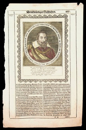 BAYERN, Maximilian I. Herzog von Bayern (1573-1651) ca. 1640. Portrait kolorierter Kupferstich auf der ganzen Buchseite ; Seitenformat ca. 32 x 20 cm, Blatt teils mit kl. L?suren , aus Theatrum Europaeum Merian c. 1640. Antike Druckgrafik, antique print.