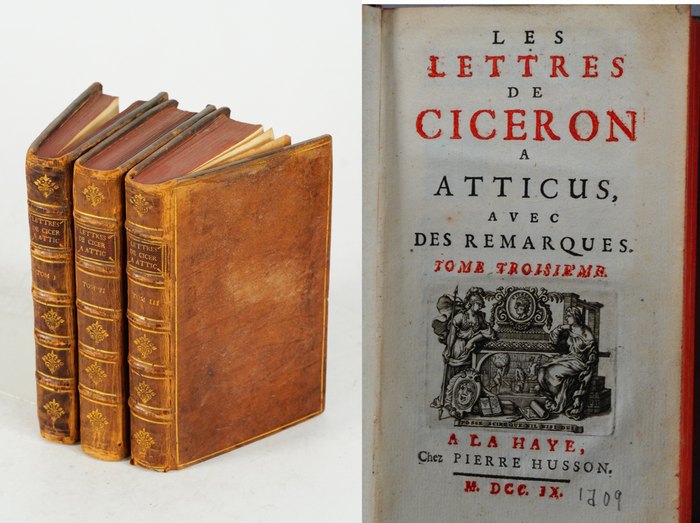 Les Lettres de Ciceron a Atticus avec des Remarques Tom. 1-3. Mit einem Frontispiz und je einer Titelvignette. La Haye, Pierre Husson, 1709. 268, 310, 297 S.. Lederbände. Kl.-8vo. Leder etwas berieben. Kapitale und Ecken mit geringen Läsuren. Sonst gutes Exemplar.