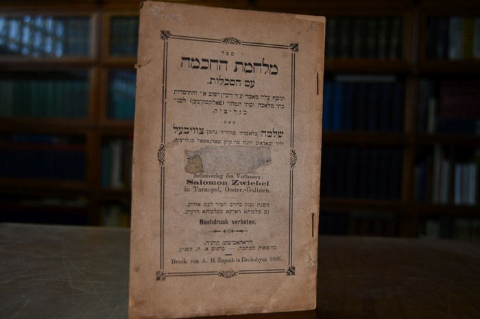Milchemet HaChochma Im HaSichlut (Der Krieg der Weisheit mit der Dummheit). Tarnopol, Oester.-Galizien, Selbstverlag des Verfassers; Druck: Drohobycz, A.H. Zupnik, 1895. 30 S. 20 x 12 cm, Broschur. Berieben, bestoßen, gebräunt, fleckig und mit Resten einer Überklebung auf dem Vorderdeckel. Heftklammern korrodiert. Papierbedingt gebräunt. Die Broschüre enthält auch Ausführungen über die Besiedlung des Landes Israel und über die Gründung von Werkstätten und Suppenküchen für die Juden in Galizien. Sehr selten. Im KVK an keiner deutschensprachigen Bibliothek nachweisbar.