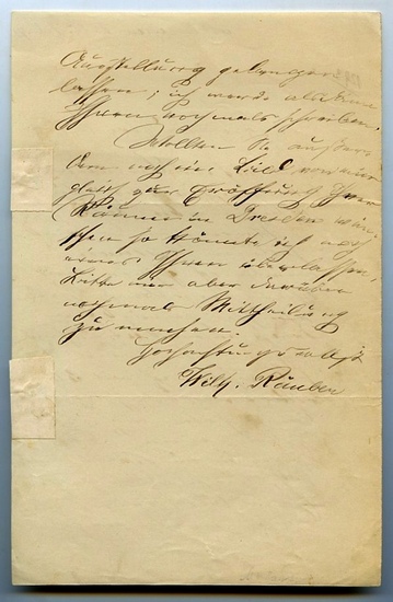 Eigenh. Brief mit U. (?Wilh. Räuber?). München, 20. Juli 1892. 1? SS. Gr.-8vo. An einen namentlich nicht genannten Adressaten: ?Mein auf der Berliner Akademischen Ausstellung sich befindendes Bild ?Morgens an der Trinkhalle in Kissingen? werde ich Ihnen nach Schluß derselben, Ihrem Wunsche gemäß per Fracht unfrankirt zusenden. Den Preis desselben setze ich mit 3600 Mk. an [...]?. ? Wilhelm Räuber studierte u. a. bei Wilhelm von Diez und Alexander Wagner an der Kunstakademie in München, wo er dann von 1876 als freischaffender Historien-, Genre- und Bildnismaler tätig sein sollte. ?Zu seinen Werken zählen ?Kaufleute ziehen im Mittelalter über die Alpen?, ?Einholung einer Braut? und ein Portrait des Prinzregenten Luitpold von Bayern? (DBE). ? Im rechten Rand gelocht und dort alt hinterlegt.