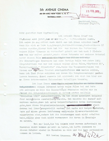 Ms. Brief mit eigenh. Unterschrift. Southbury, Conn., 18. XII. 1958. Gr.-4to. 1 p. Gedr. Briefkopf ?5th Avenue Cinema?. Mit Eingangsstempel. Gelocht. An einen Herrn Kipfmueller: ?[?] Wenn Sie sich an Herrn R.A. Draeger, Berlin-Friedenau [?] wenden wuerden, dieser Herr hat bis vor kurzem die Vertretung meines Films ,Traeume zu verkaufen? gehabt und hat noch 5 Plakate von mir selbst gemacht, sowie einen Fotosatz und anderes Material ueber diesen Film. Die Cinematheque Francaise hat eine farbige Rolle vom Jahre 1923 (Reproduktion) von mir und einige meiner alten Filme, ,Rhythmus 21?, Vormittagsspuk, ,Filmstudie? etc. Falls Sie Vergroesserungen von Scenen aus meinen ganz fruehen Avantgardefilmen machen wollen, kann ich Ihnen Fotos schicken von denen Sie Vergroesserungen machen lassen koennen. [?]?Hans Richter orientierte sich zunächst am Kubismus und Expressionismus. 1916 schloss sich Richter in Zürich den Dadaisten an. 1921 kam er zum experimentellen Film, wobei Richter dessen abstrakte Spielart (Film als musikalische Analogie) wesentlich weiterentwickelte. 1940 emigrierte Richter in die USA.