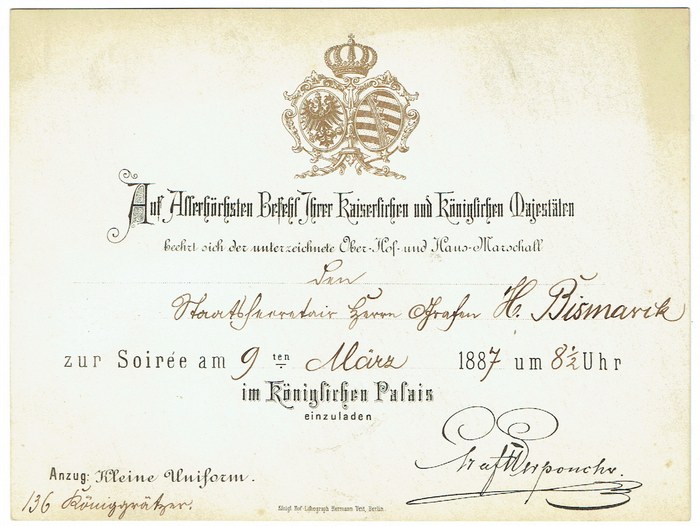 Einladung mit eigenh. Unterschrift. Berlin, 9. III. 1887. Quer-gr.-8vo. ?Auf Allerhöchsten Befehl Ihrer kaiserlichen und königlichen Majestäten beehrt sich der unterzeichnete Ober-Hof und Haus-Marschall den Staatssecretair Herrn Grafen H. Bismarck zur Soirée [?] im königlichen Palais einzuladen?.