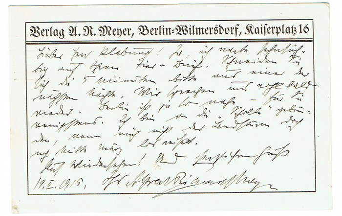 Eigenhändige Postkarte mit Unterschrift. Berlin-Wilmersdorf, 19. II. 1915. Quer-kl.-8vo. 1 p. Gedr. Adresse. An Klabund [d.i. Alfred Henschke] in München: ?[?] Schneiden Sie sich die 5 Minuten bitte aus einer der nächsten Nächte. Wir sprechen uns wohl bald wieder. Berlin ist ja so nahe - für Sie wenigstens. Ich bin an die ,Scholle? gebunden, wenn mich nicht der Landsturm doch noch Mitte März los reißt. [?].