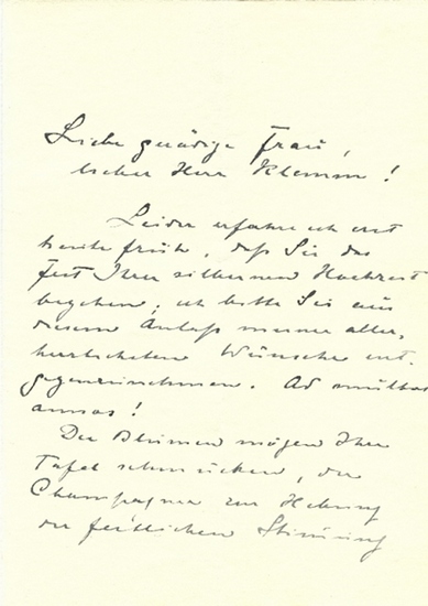 Eigenh. Brief mit U. Stuttgart, 25. Mai 1924. 2 SS. auf Doppelblatt. Gr.-8vo. An das Ehepaar Klemm: ?[?] Leider erfahre ich erst heute früh, daß Sie das Fest Ihrer silbernen Hochzeit begehen; ich bitte Sie aus diesem Anlaß meine allerherzlichsten Wünsche entgegenzunehmen [?]? ? Beiliegt: e. Briefumschlag u. 1 faksimilierter Brief. Nach dem Besuch des Polytechnikums in Stuttgart und der praktischen Ausbildung zum Hüttenfachmann in Ungarn und Mähren sowie in Mülheim/Ruhr wurde Reusch 1905 Vorstandsmitglied, 1909 Vorstandsvorsitzender und schließlich Generaldirektor der Gutehoffnungshütte AG in Oberhausen. Unter seiner Leitung expandierte die Gesellschaft nach dem Ersten Weltkrieg vor allem in die Weiterverarbeitung. Er war 1918 Mitbegründer der Deutschen Werft in Hamburg, erwarb zahlreiche Beteiligungen für die Gutehoffnungshütte AG, darunter 1921 die Aktienmehrheit der Maschinenfabrik Augsburg-Nürnberg sowie drei süddeutsche Zeitungen (u.a. die ?Münchner Neuesten Nachrichten?). Als Vorsitzender des Vereins Deutscher Stahlindustrieller (1924-30) sowie in zahlreichen weiteren führenden Positionen im schwerindustriellen Verbandswesen war er einer der einflußreichsten Industriellen der Weimarer Republik. Reusch beteiligte sich 1928 an der Gründung des Bundes zur Erneuerung des Reiches, der den Abbau der parlamentarischen Demokratie betrieb. 1932 trat er vorübergehend für eine Zusammenarbeit mit der NSDAP ein, geriet aus wirtschaftspolitischen Gründen nach 1933 zunehmend in Gegensatz zum Regime und mußte 1942 seine Ämter niederlegen.