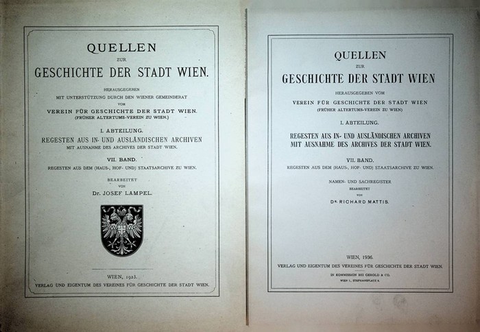 Quellen zur Geschichte der Stadt Wien. Abt. 1, Regesten aus I-und Ausl?ndischen Archiven mit Ausnahme des Archives der Stadt Wien. VII. Band REGESTEN AUS DEM HAUS- HOF- UND STAATSARCHIVE ZU WIEN: berabeitet von Josef Lampel + NAMEN -UND SACHREGISTER/ bearb. von Richard Mattis hrsg. vom Verein f?r Geschichte der Stadt Wien (fr?her Altertums-Verein zu Wien). Wien, : Verl. d. Vereines f?r Geschichte der Stadt Wien, 1923/ 1936. 2 original Broschuren; 4?,488 Seiten + 2 Blatt, Seite 489-578.