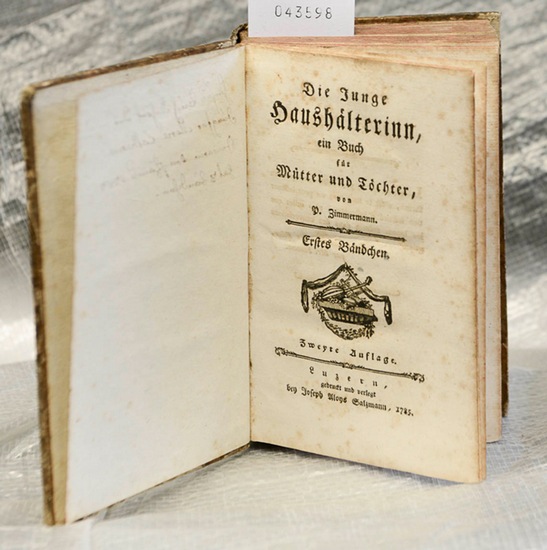 Die junge Haushälterin ein Buch für Mütter und Töchter - Erstes Bändchen (von 3) Luzern (Joseph Aloys Salzmann) 1785 (= 2.Auflage). 8°, Originalpappband der Zeit (Hardcover) 367 S,. Kleine Vignetten. Versand mit DHL/Deutsche Post in PLASTIKFREIER Verpackung, beschabt, Bezugspapier mit kleineren Fehlstellen, Ecken durchgerieben, handschriftliche Widmung auf Vorsatz (datiert 1787), papierbedingt gebräunt, ordentliches Exemplar, seltene frühe Auflage.