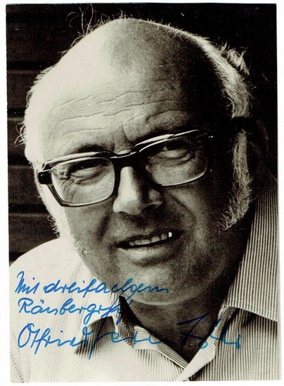 Portraitpostkarte mit eigenh. Unterschrift. ohne Ort und Datum. 100 : 150 mm. Brustbild von vorn. - Mit eigenh. Zusatz ?Mit dreifachem Räubergruß?. - Sein Werk besteht aus 38 Kinder-, Jugend- und Bilderbüchern, die bekanntesten sind Der kleine Wassermann, Die kleine Hexe, Der Räuber Hotzenplotz, Das kleine Gespenst und Krabat. Preußlers Bücher wurden in 55 Sprachen übersetzt und haben eine Gesamtauflage von 50 Millionen Exemplaren erreicht.