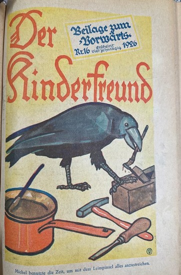 DER KINDERFREUND. Jg. 1925 - 1932 in 8 Bänden. Beilage zum "Vorwärts", ab 1931: Beilage der Sozialdemokratischen Tageszeitungen. Erscheint vierzehntägig. Herausgeber: Reichsarbeitsgemeinschaft der Kinderfreunde. Berlin: Vorwärts. 1925-32. Jedes Heft mit farbigen Titelblatt und mit zahlreichen, vielfach farbigen Textillustrationen. 1926-1928 gedruckt in Blau und Schwarz. 22 x 15 cm. Jg. 1925 - 1932 in 8 Orig.-Leinenbände mit goldgeprägtem Titel und teilweise marmoriertem Schnitt. Allumfassende und unterhaltsame Kinderzeitschrift mit z.T. humorvollen Illustrationen. Nicht außer acht gelassen werden zeitnahe Berichte in Text und Bild. - 2 Rücken verblaßt, im Jg. 1932 fehlen Bl. 231/32 (Rätselecke?) und Bl. 239/40. Papierbedingt minimal gebräunt. Überwiegend gut erhaltene Reihe.