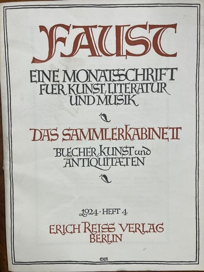 FAUST. Eine Monatsschrift für Kunst, Literatur und Musik. Jg. 1-4, 1921/23-1925/26 in 36 Heften (komplett). Hrsg. u.a. von Anton Mayer und Paul Landau. Berlin,: Julius Bard, Erich Reiss. 1921-1926. Mit zahlr. Abbildungen im Text und auf Tafeln. 29 x 22, 23 x 17,5 cm. Dietzel-Hügel 941. Bis Jg. 1, H. 5: Eine Rundschau für Kunst und Mythos mit jeweils 1 Beilage. Ab Jg. 1, Heft 6 - Jg. 3, Heft 11/12 mit dem Untertitel: Das Sammlerkabinett Bücher, Kunst und Antiquitäten. - Musikbeilagen in den ersten 5 Heften u.a.: Scherzo von Franz Liszt Hrsg. von Ferruccio Busoni; Heinz Tiessen: Sehnsucht, Wladimir Vogel: Die Bekehrte; Reinhard Keiser: Arie aus der Oper "Adonis" 1697; Duettino von E. Th. Hoffmann; 4 Blätter aus der Tantz-Schul von Gregorio Lambranzi, mit Figurinien. Jeweils zum 1. mal veröffentlicht. - Komplettes Exemplar dieser bedeutenden Zeitschrift für schöne Künste. Es handelt sich um Hefte mit Themenschwerpunkten aus allen Lebensbereichen. Mit Beiträgen u.a. von Adolph Behne, Wassily Kandinsky, El Lisitzky, Gottfried Benn, Theodor Däubler, Egon Erwin Kisch, Anette Kolb, A.R. Meyer, Franz Hessel, Ferruccio Busoni, Paul Zech, Julius Müller-Graefe, Lou Andreas-Salome, Kasimir Edschmid, Klabund, Arnold Zweig, Egon Erwin Kisch. - Einige Hefte mit Rostflecken durch Klammerheftung und kleinen Fehlstellen am Rücken. Insgesamt ordentliches Exemplar.