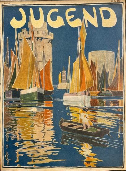 JUGEND 1903. Münchner Illustrierte Wochenschrift für Kunst und Leben. 8.Jg. 1903, 52 Nummern in Original- Heften, kompletter Jahrgang. München: Hirth. 1903. Mit zahlreichen, teils ganz- oder doppelseitigen, sowie farbigen Illustrationen. 30 x 23 cm. Dietzel-Hügel 1516; Schlawe 51.- Farbig illustrierte Titelblätter u.a. von: Julius Diez, Giovanni Segantini, Fr. v. Lenbach, F.A. v. Kaulbach, Adolf Münzer, Eugen Spiro, Max Feldbauer. - Bis auf leichte Randbräune sehr gut erhaltene Hefte.