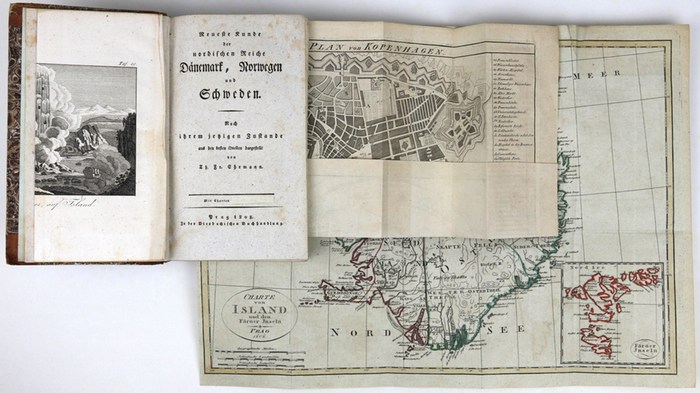 Neueste Kunde der nordischen Reiche Dänemark, Norwegen und Schweden. Nach ihrem jetzigen Zustande aus den besten Quellen dargestellt. Prag, Diesbach 1808 (Reihentitel datiert 1807). * Mit 3 mehrfach gefalteten, kolorierten Kupferstich-Karten, 4 mehrfach gefalteten Kupferstich-Plänen und 9 (statt 14) Kupferstich-Tafeln, davon 7 ausschlagbar; dazu 2 doppelt eingebundene Kupferstich-Tafeln. 1 Blatt, 604 Seiten. 20,5 x 12,5 cm. Hellbrauner Halblederband der Zeit (Ecken bestoßen) mit Marmorpapierbezug (beschabt) sowie goldgeprägtem Rückentitel und Rückenvergoldung. (Neueste Länder- und Völkerkunde, Band 4). *** Engelmann 709. ADB V, 721. - Prager Nachdruck der zuerst im Weimarer Landes-Industrie-Comptoir erschienenen skandinavischen Landeskunde, bearbeitet von Theophil Friedrich Ehrmann (1762-1811). Mit den drei großen Karten von Dänemark; Island und den Färöer-Inseln sowie Schweden und Norwegen. Die gefalteten Pläne zeigen Kopenhagen, Trollhättan und Stockholm sowie den Holsteinischen Kanal zwischen Rendsburg und der Kieler Förde. - Reihentitel mit altem Besitzvermerk. Gelegentlich leicht braunfleckig.