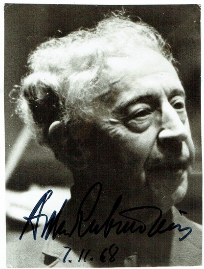 Portraitphotographie mit eigenh. Unterschrift. ohne Ort und Jahr, 7. XI. 1968. 150 : 100 mm. Leichte Knickspuren. Brustbild im Profil nach rechts. Verso mit montierten biogr. Daten. Leicht geknickte Eckchen.