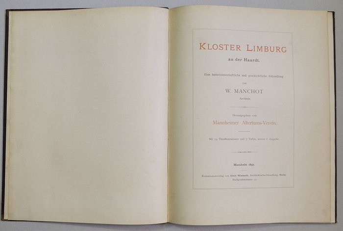 Kloster Limburg an der Haardt . Eine bauwissenschaftliche und geschichtliche Abhandlung. Kommissionsverlag Wasmuth, Berlin, Mannheim, 1892. 4°, IX, 89 S., mit 54 Textillustrationen und 7 Tafeln (davon 6 Falttafeln), Halbleinwandeinband der Zeit (stärker berieben, Tafeln an den äußersten Rändern etwas fleckig) *Bad Dürkheim. (IL).