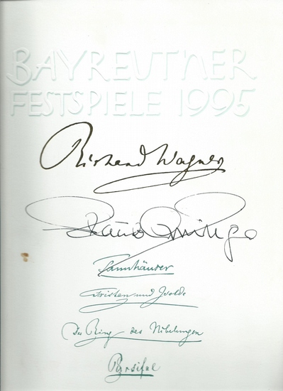 Festspielbuch Bayreuther Festspiele 1995 / Tannhäuser und der Sängerkrieg auf Wartburg - Tristan und Isolde - Der Ring der Nibelungen - Parsifal / (Handschriftlich signiertes Exemplar Pacido Domingo) Bayreuth, Bayreuther Festspiele GmbH, 1995. 214 S., 32,5 cm x 23,5 cm, kartoniert/broschiert. Eintragsfrei. Einband nicht wie neu,da farblichg empfindlich. Brauner Fleck vorderseitig, wesentlich kleiner Buchrücken oberes Drittel. Insgesamt noch gutes Exemplar. Aus Raucherhaushalt, daher mit entsprechendem Geruch. Vorderseitig eigenhändig signiert Plàcido Domingo, der 1995 zum letzten Mal den Parsifal sang. (Hinweis: "Plàcido Domingo" ist eigenhändige Signatur, alle anderen Schriftzüge auf der Heftvorderseite sind serienmäßig gedruckt.).