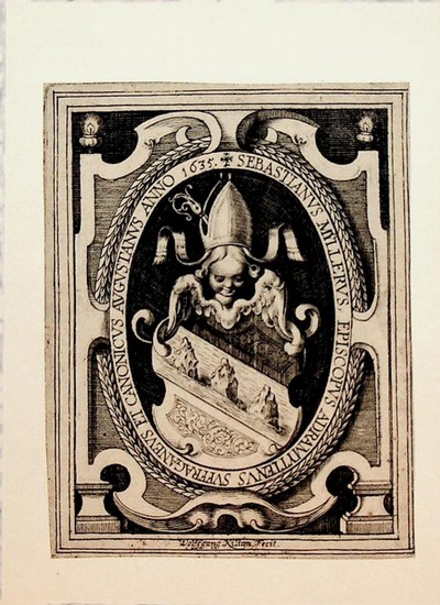 Wappen des Sebastian M?ller (1584-1644) Titularbischof von Adramyttium und Weihbischof in Augsburg. Exlibris 1635. Originalkupferstich von Wolfgang Kilian (1581-1662), 10 x 7,5 cm, punktuell auf Tr?gerkarton montiert.