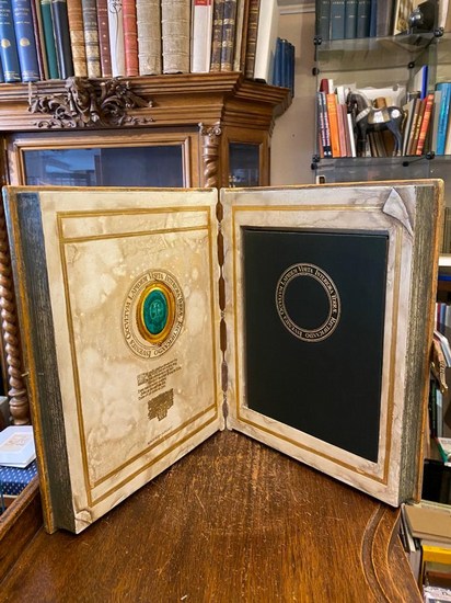 Manfred Scharpf : Maler: Visita - Interiora - Terrae - Rectificando - Invenies - Occultum - Lapidem. Isny-Herrenberg, Mafred Scharpf / Münster, Verlag Galerie Steinrötter, (1983). 8° (22x18) / 4° (30x24), 96 S., mit 21 mont farb WerkAbb., 3 mont dokumentarischen Aufnahmen, sowie Abb. im Text, grüner OSeideneinband mit goldPräg auf Deckel und Rücken, Lesebändchen, in Schmuckkassette in Buchform,. Buchrücken etwas aufgehellt, Vorzugsausgabe in Schmuckkassette (Masse 30 x 24 x 7 cm), gestaltet von Manfred Scharpf in Form eines mittelalterlichen Folianten mit aufgesetzten Ornamenten, Vergoldung, Metallschließe an Lederband.-.