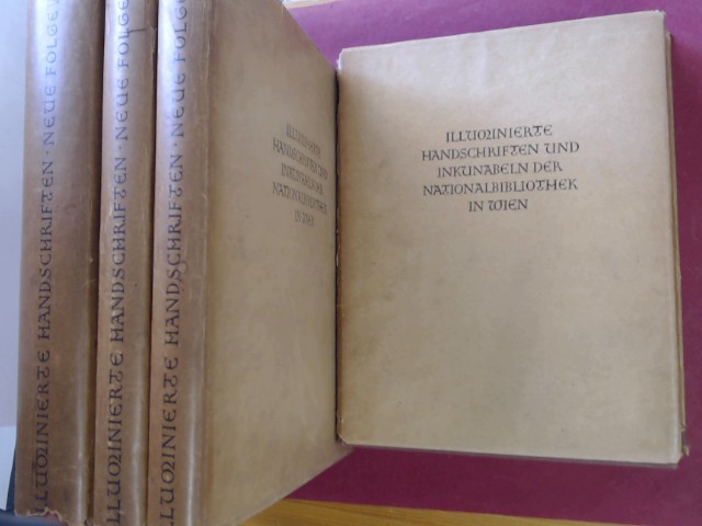 Die Handschriften und Inkunabeln der italienischen Renaissance (vollständig in 4 Bänden). Band 1 Oberitalien: Genua, Lombardei, Emilia Romagna; Band 2 Oberitalien: Venetien; Band 3 Mittelitalien: Toskana, Umbrien, Rom; Band 4 Unteritalien: Neapel, Abruzzen, Apulien und Calabrien. Anhang: Nachahmungen italienischer Miniaturhandschriften. VI. Teil, VIII. Band aus der Reihe "Beschreibendes Verzeichnis der illuminierten Handschriften in Österreich: Die illuminierten Handschriften und Inkunabeln der Nationalbibliothek in Wien". Leipzig: Hiersemann, 1930 - 1933. 234; 280; 223; 154 Seiten mit zahlreichen s/w Abbildungen auf 248 Tafeln. Orig.-Leinenbände mit Schutzumschlag. Die Schutzumschläge sind, besonders am Rücken, gebräunt und sehr brüchig, bei Band 1 ist er bereits am Rücken komplett aufgebrochen. Sonst handelt es sich um ein gutes Exemplar mit nur leichten Gebrauchsspuren. Textsauber und aus einem Nichtraucherhaushalt. Dieses Exemplar stammt aus der Bibliothek von Peter Amelung (Württembergische Landesbibliothek Stuttgart).