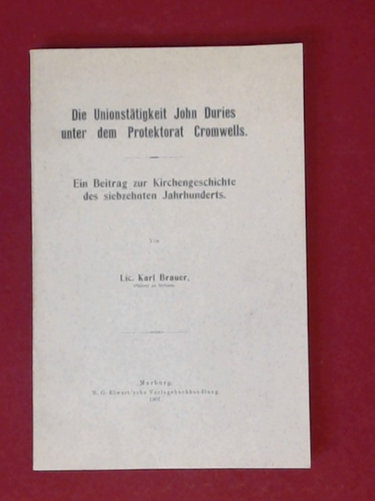 Die Unionstätigkeit John Duries unter dem Protektorat Cromwells. Ein Beitrag zur Kirchengeschichte des siebzehnten Jahrhunderts. Marburg: Elwert Verlag, 1907. Nachdruck. X, 252 Seiten Original-Broschur. Gutes Exemplar mit nur leichten Gebrauchsspuren. Namenseinträge auf den ersten Seiten, ansonsten textsauber. Buch aus einem Nichtraucherhaushalt.