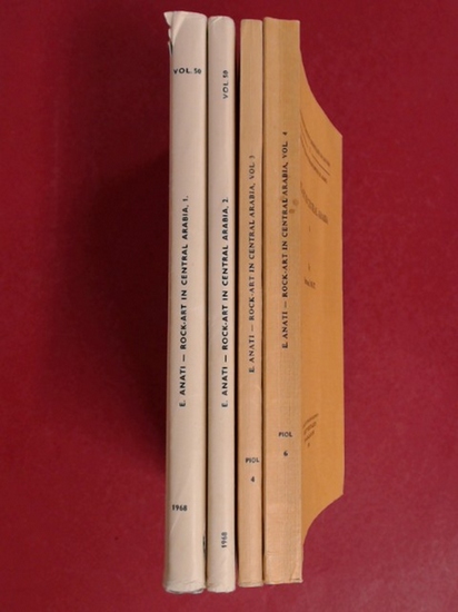 Rock-Art in Central Arabia (complete in 4 volumes). Expédition Philby-Ryckmans-Lippens en Arabie, 1ère partie: Géographie et Archéologie, tome 3. Vol. 1: The "oval-headed" people of Arabia; Vol. 2, Part. 1: Fat-tailed sheep in Arabia; Vol. 2, Part. 2: The realistic-dynamic style of Rock-Art in the Jebel Qara; Vol. 3: Corpus of the Rock Engravings, Part 1: General Information, Part 2: Sectors A-H - From Ta`if to Mahash wells; Vol. 4: Corpus of the Rock Engravings (continued), Part 3: Sectors J-Q: From Wadi Khaniq to Najran, Part 4: Animal engravings in Centra Arabia. A study of the fauna from Sectors A-Q (by E. Tchernov). Louvain: Institut Orientaliste, 1968-1974. VI, 196; VI, 78; V, 167; 262 mit zahlreichen s/w Abbildungen (Fotos und Zeichnungen), Tabellen und Karten. 2 Original--Leinenbände mit Schutzumschlägen und 2 Original-Broschuren. Gutes Exemplar mit nur leichten Gebrauchsspuren. Textsauber und aus einem Nichtraucherhaushalt. Dieses Exemplar stammt aus der Bibliothek von Walter W. Müller, Professor für Semitistik an der Philipps-Universität Marburg. Der renommierte italienische Archäologe Anati war, wie Walter W. Müller in seiner (neben anderem den Bänden beiliegenden) Rezension schreibt, wie kaum jemand sonst durch seine Untersuchungen prähistorischer Bilder in Asien und Europa vorbereitet, die Felszeichnungen zu bearbeiten, die die Expedition Philby-Ryckmans-Lippens 1951/52 auf ihrer über 5000 km langen Route durch die Arabische Halbinsel aufgenommen hat: 232 Negative von etwa 200 Felszeichnungen, auf denen fast 3000 Figuren dargestellt sind. Damit wurde das Wissen über die Geschichte Arabiens bis in 5. Jahrtausend v. Chr. erheblich erweitert. // 2 original hardcovers in dust jackets and 2 original softcovers. Clean books in good condition. Books from a non smoking environment. This copy comes from the library of Walter W. Müller, Professor of Semitic Studies at the Philipps University of Marburg. As Walter W. Müller writes in his review (among other things included in the volumes), the renowned Italian archaeologist Anati was prepared, like hardly anyone else, through his investigations of prehistoric images in Asia and Europe, to work on the rock carvings that the Philby-Ryckmans-Lippens expedition recorded in 1951/52 on their over 5000 km long route through the Arabian Peninsula: 232 negatives of around 200 rock carvings in which almost 3000 figures are depicted. This extended the knowledge of the history of Arabia up to the 5th millennium BC significantly.