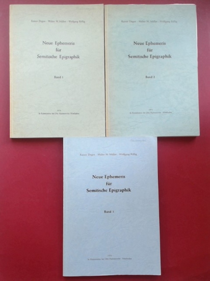 Neue Ephemeris für Semitische Epigraphik (vollständig in 3 Bänden). Wiesbaden: Otto Harrassowitz, 1972-1978. 144 Seiten, XVI Tafeln; 175 Seiten, XIV Tafeln; 178 Seiten, XI Tafeln mit zahlreichen s/w Abbildungen. Großformat, Original-Broschuren. Die Buchrücken sind ausgeblichen und die Einbände in unterschiedlichen Graden lichtrandig und leicht fleckig, sonst handelt es sich um ein gutes Exemplar mit nur leichten Gebrauchsspuren. Es war das Handexemplar eines der Ko-Autoren und enthält vereinzelte Bleistiftanmerkungen. Bücher aus einem Nichtraucherhaushalt. Dieses Exemplar stammt aus der Bibliothek von Walter W. Müller, Professor für Semitistik an der Philipps-Universität Marburg.