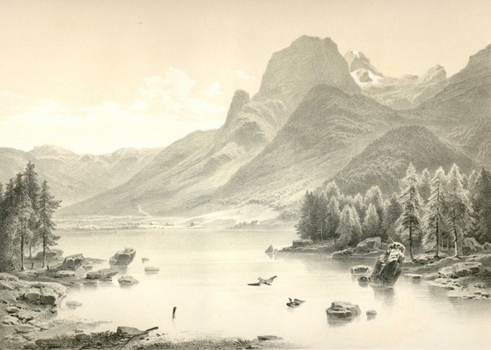 (Salzburg) - Ramsauer Hinter-See [b. Berchtesgaden]. Salzburg, Schoen, o.J. [um 1849]. Lithographie. 21 x 26,5 cm. 31 x 41 cm., Abbildung. N/W 502.83 - Aus: Pezolt, Georg: Salzburg und seine Angrenzungen...